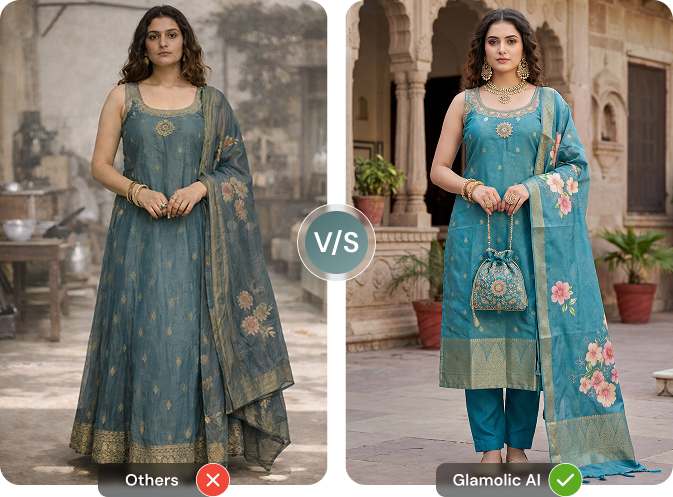 From Sarees & Lehengas to Blazers, Jeans & Kids wear — Glamolic AI supports all Indian and western fashion categories.