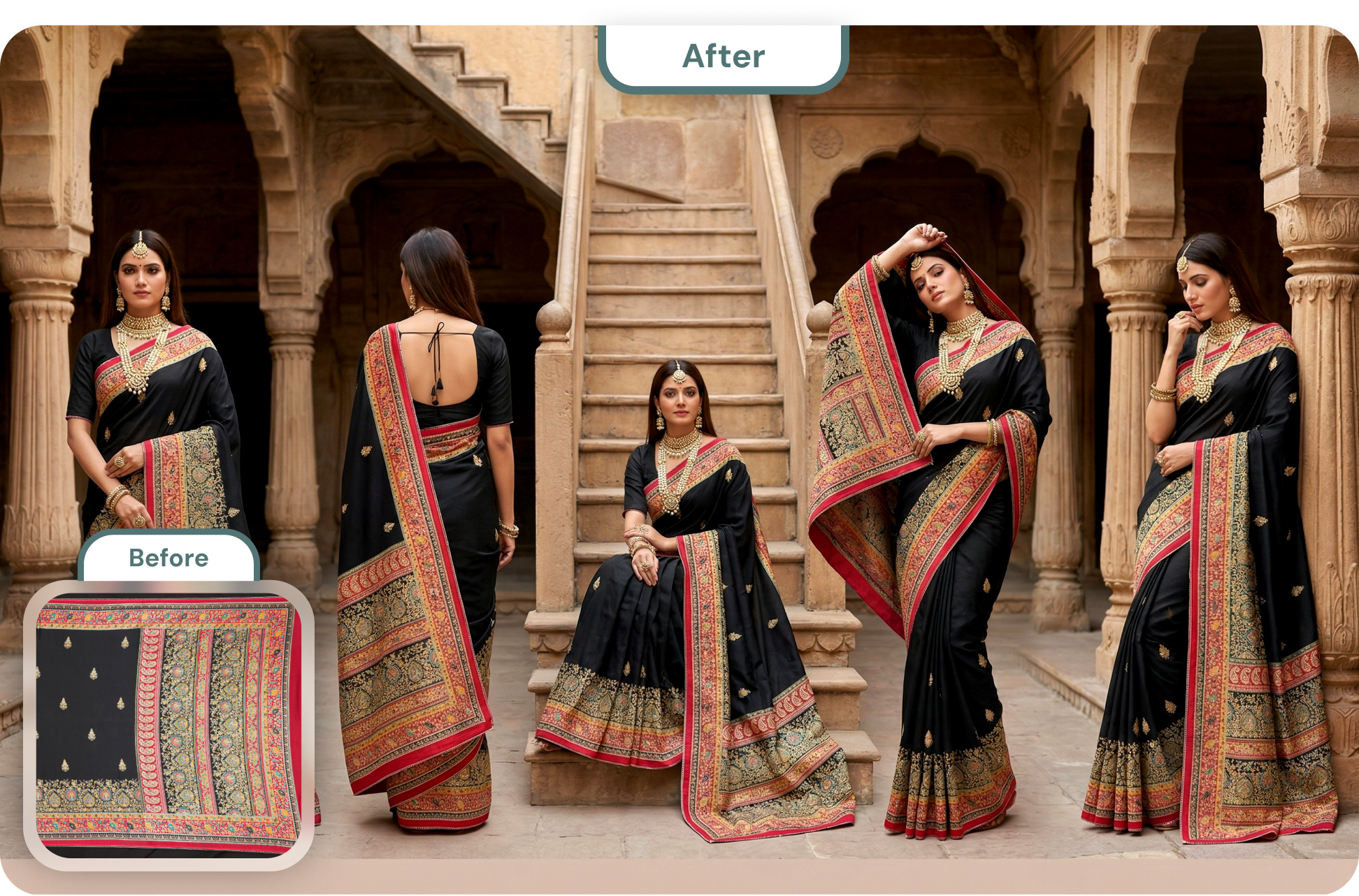 Upload your outfit and get professional AI model photos in seconds. Perfect for Sarees, Lehengas, Kurtis, Western wear & more. No studio. No photographer. No editing required.